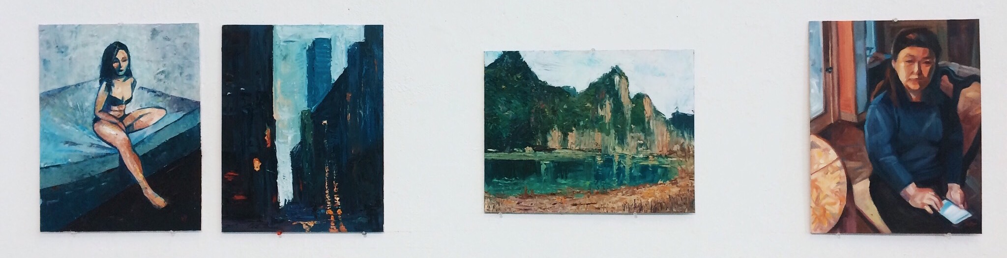 Below is my final exhibit of my artworks from the class. The two landscapes were made using only a palette knife, adding to a more messy and impressionist feel.