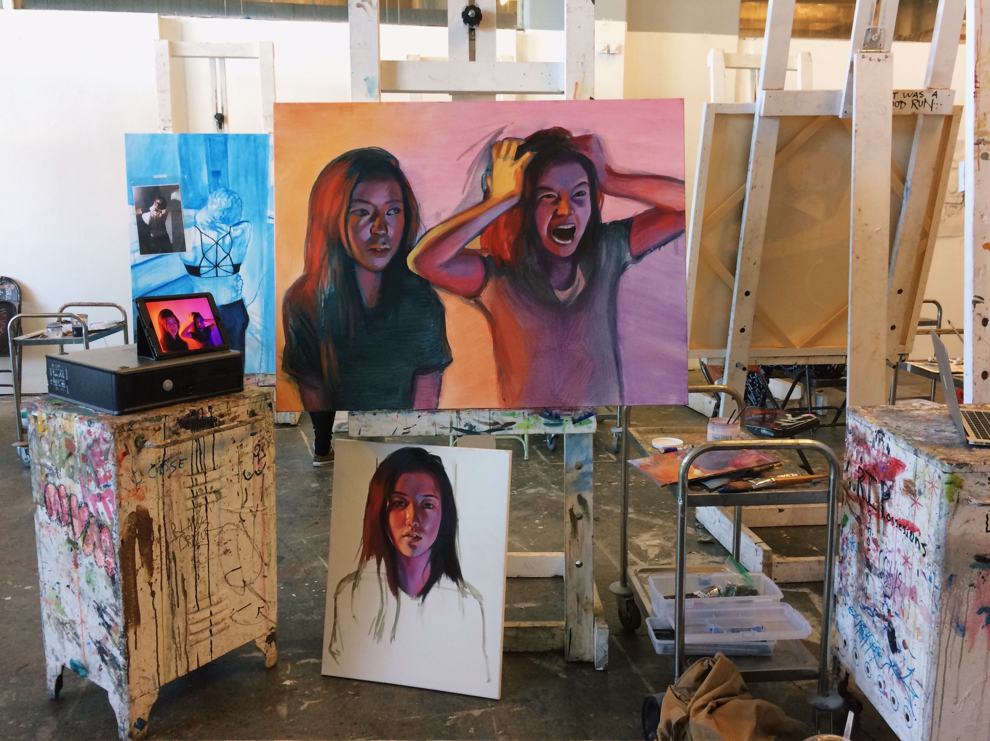incorporated narratives and self-expression in the painting. Many of my classmates, including myself, opted for self-portraits done on giant canvases. Caitlin